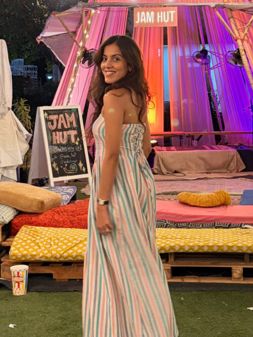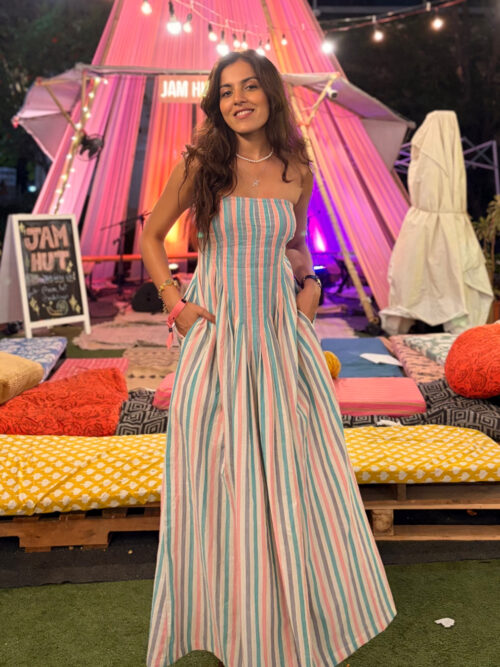 The Bella Maxi Dress blends Indian craftsmanship with modern charm. Hand-blocked florals in shades of purple, pink, and green meet a batik-dyed hemline. Made from organic cotton, it features a drop-waist silhouette with adjustable straps and pockets for everyday ease. The neckline, adorned with delicate wooden beads, adds a charming artisanal detail. Wear it to brunches, mehndi events, or vacations—it’s beautiful, functional, and comfortable.