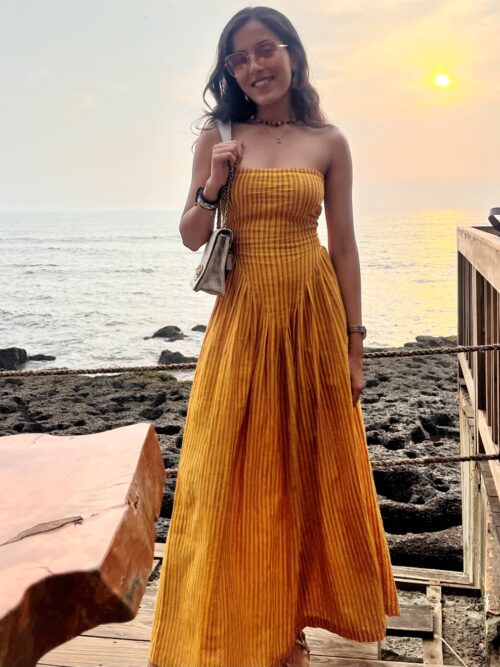 The Ira Dress—bold in color, soft in feel, and effortlessly romantic. Who knew khadi could drape like this? Handwoven in deep red cotton, it flows beautifully with a sculpted bodice and gentle pleats. Designed to flatter, its adjustable straps and intricate drawstring back add a hint of allure while ensuring a perfect fit. Whether you’re dressing up for a date or indulging in a little self-love, this one makes every moment special. And yes, it has pockets—because elegance should never compromise on ease.
