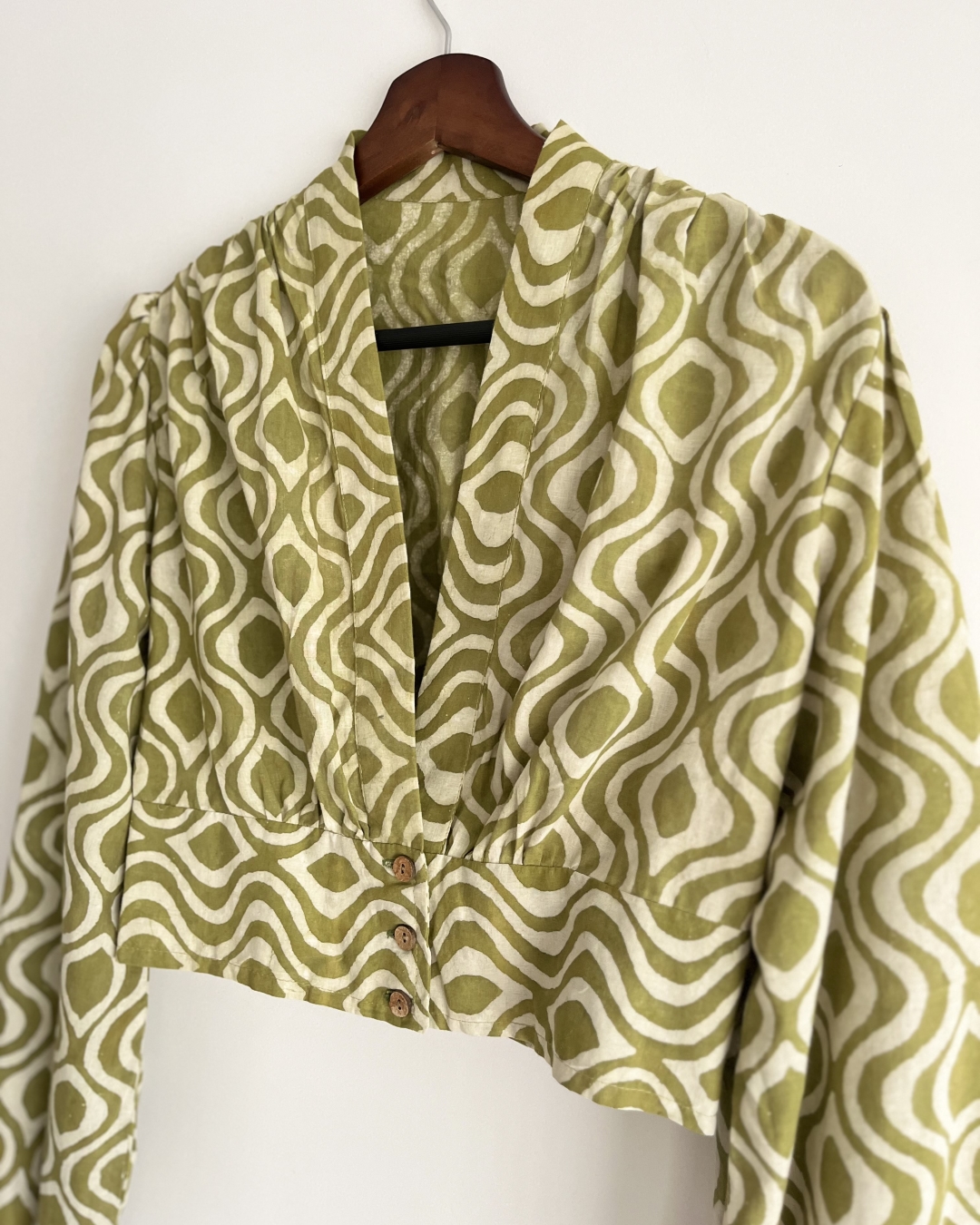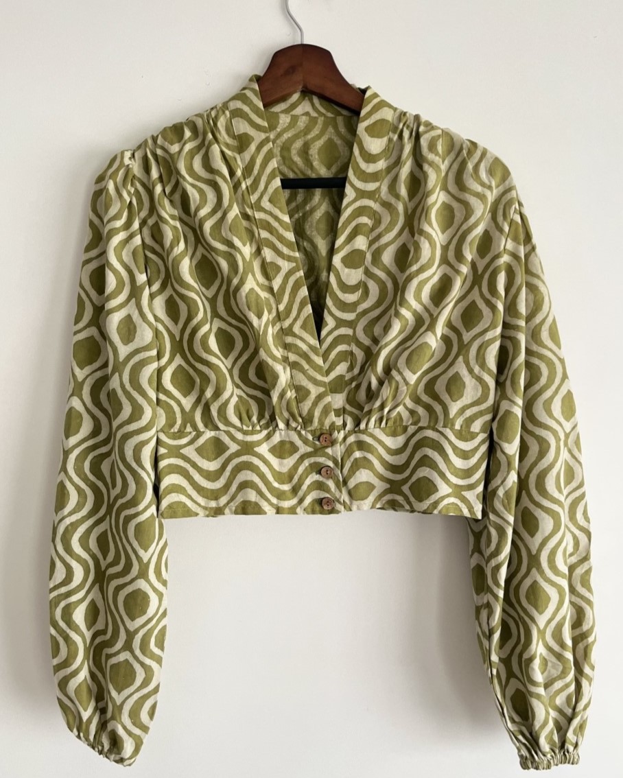 The Wavy Top in green is a graceful blend of comfort and style. Made from pure cotton and hand block printed with delicate wave patterns, this mid-length top features an overlapping V-neck and full sleeves with subtle puff details for a touch of femininity.